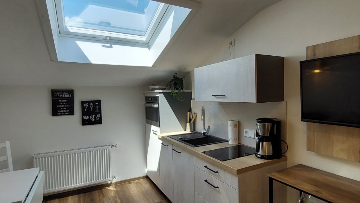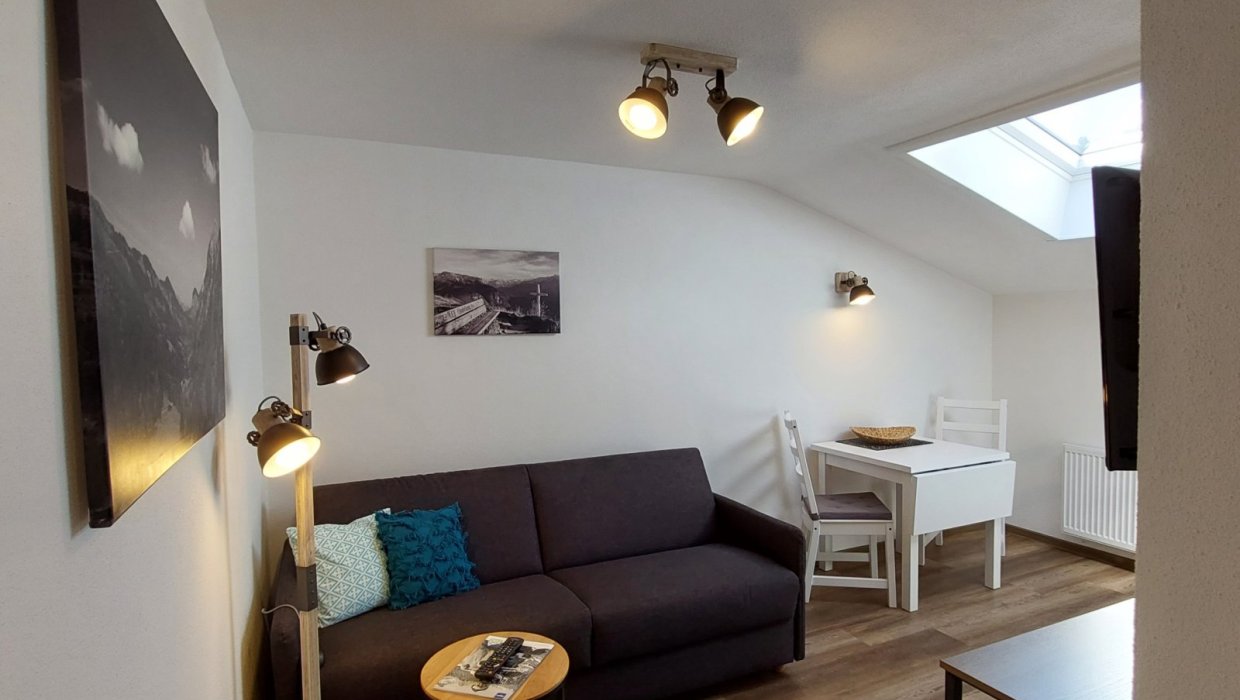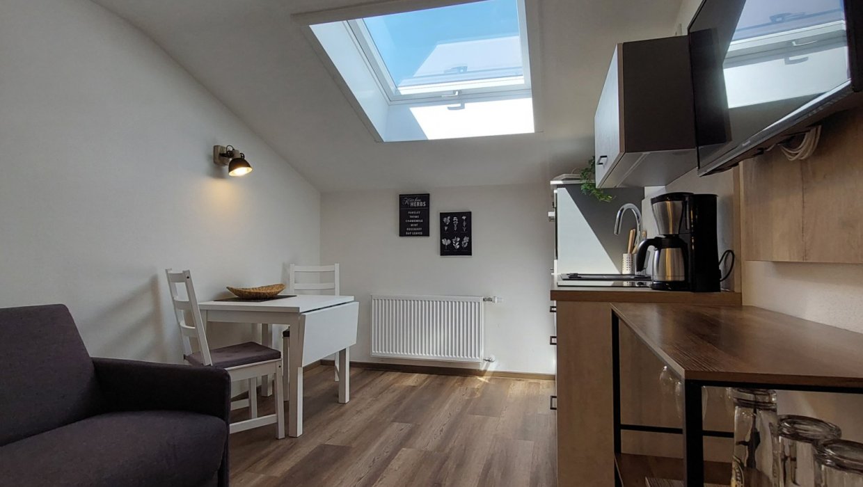 Das Studio verfügt über ein separates Schlafzimmer mit komfortablem Doppelbett und getrennten Matratzen (2 × 0,90 m × 2,00 m), das für erholsamen Schlaf sorgt. Die voll ausgestattete Wohnküche mit Essecke bietet Spülmaschine, Mikrowellen-/Backofen-Kombigerät und Kühlschrank. Ein gemütliches Sofa lässt sich bei Bedarf in ein Bett für eine dritte Person umwandeln.